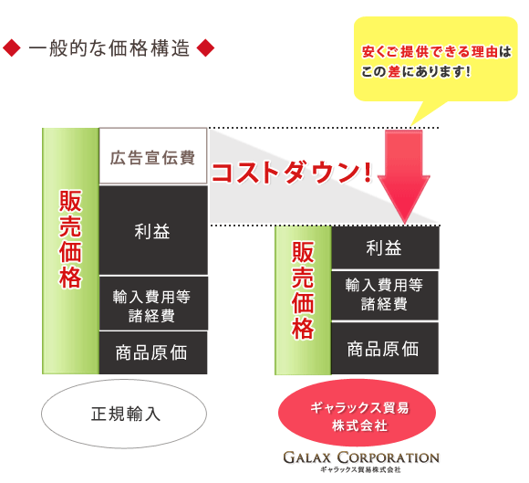 取扱い商品全てを卸価格にてご提供しております。これは直輸入をしておりますので出来る仕組みですが、その仕組みの内容を下記に詳述致しました。